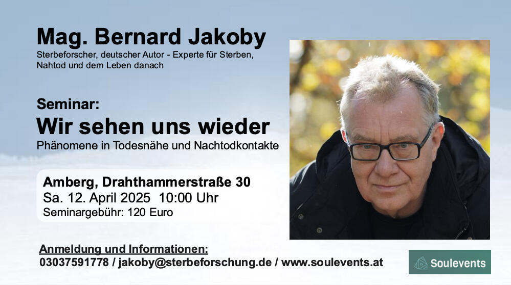 Phänomene in Todesnähe und NachtodkontakteJa, es gibt ein Leben nach dem Tod. Bernard Jakoby gelingt es, diese These zu beweisen. In aktuellen Berichten über Nahtoderfahrungen und Nachtodkontakte, in Rückführungsprotokollen und in Mediendokumentationen werden erstaunlich übereinstimmende Szenarien der geistigen Welt beschrieben. Jakoby hat dieses Wissen gesammelt. Er beschreibt die unterschiedlichen Jenseitsebenen und die Stationen der Seelenentwicklung, die wir alle durchlaufen werden und beweist: Es existiert eine Realität des Jenseits! Im Tageseminar hat jeder Teilnehmer die Möglichkeit, seine ganz persönlichen Fragen und Belange einzubringen. Es bietet einen offenen Rahmen, auch eigene Erlebnisse mit anderen zu teilen.Themen können sein: Der Sterbeprozess und die Visionen Sterbender Nahtoderfahrungen und geteilte Todeserfahrungen Nachtodkontakte und Jenseitserfahrungen.
