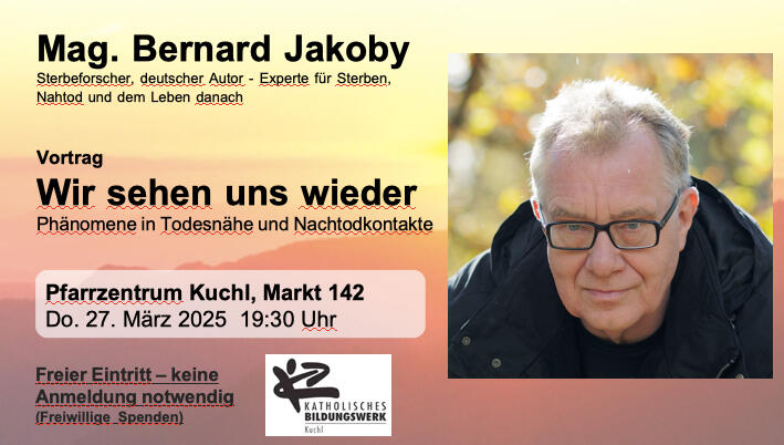 Bernard Jakoby, 1957 geboren, gilt heute im deutschsprachigen Raum als der Experte für Sterben, Nahtod und dem Leben danach. Er hat zahlreiche Bücher über Sterben, Tod und das Leben danach verfasst, von denen viele zu Bestellern avancierten und in viele Sprachen übersetzt wurden. Jakoby hält Vorträge und Seminare im gesamt deutschsprachigen Raum und berät Menschen auf Anfrage, die mit dem Tod eines Angehörigen oder auftretenden Phänomenen nicht klarkommen. Der Autor lebt in Berlin Durch seine Vorträge und Seminare trägt er wesentlich zur Enttabuisierung des Themas Tod bei. Jakoby schrieb zahlreiche sehr erfolgreiche Bücher, die in viele Sprachen übersetzt wurden. Wichtige Publikationen sind: »Keine Seele geht verloren« – »Wir sterben nie« – »Was geschieht, wenn wir sterben«.Sein neuestes Buch ist: »Wir sehen uns wieder – Phänomene in Todesnähe und Nachtodkontakte« erschien im September 2024.www.sterbeforschung.de