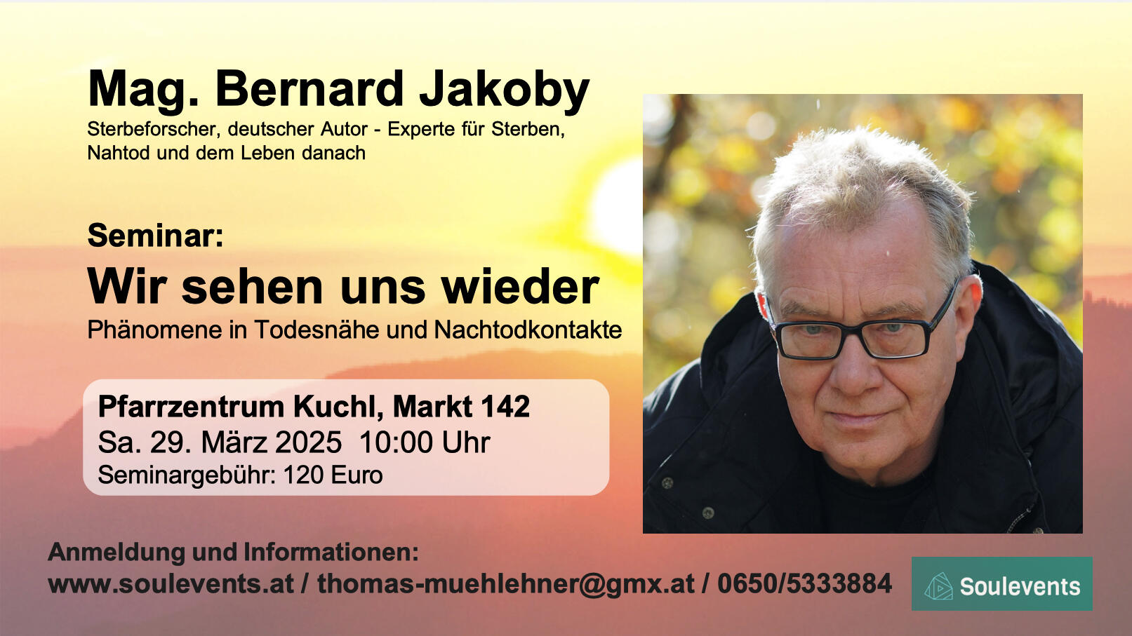 Liebe Besucherinnen und Besucher,ich bin Thomas Mühlehner und möchte Ihnen vom Herzen Veranstaltungen im Bereich Bewusstseinsbildung näher bringen.Möchten Sie regelmäßig über neueste Veranstaltungen informiert werden?Bitte senden Sie mir eine Email:[email protected]Oder tragen Sie sich in den Telegram Newsletter ein:https://t.me/soulevents_atAlles Liebe Thomas